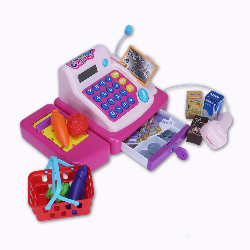 This cash register has weighing function and many accessories, such as fruit basket, drink bottle and credit card. Children can put a small basket of fruit in it to weigh it.